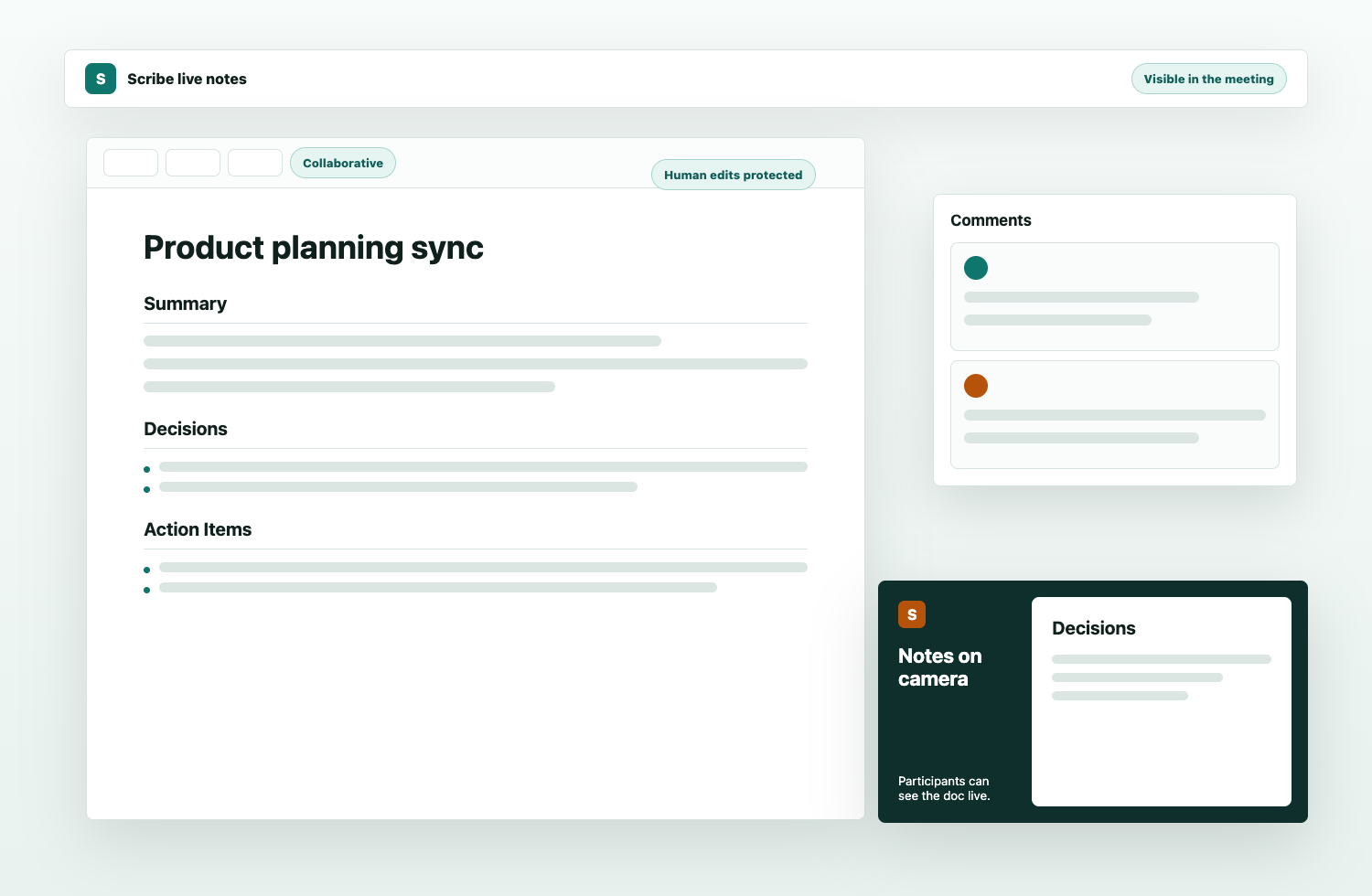 Participants can edit and comment in the shared doc, and Scribe is designed around protected human-written sections.
